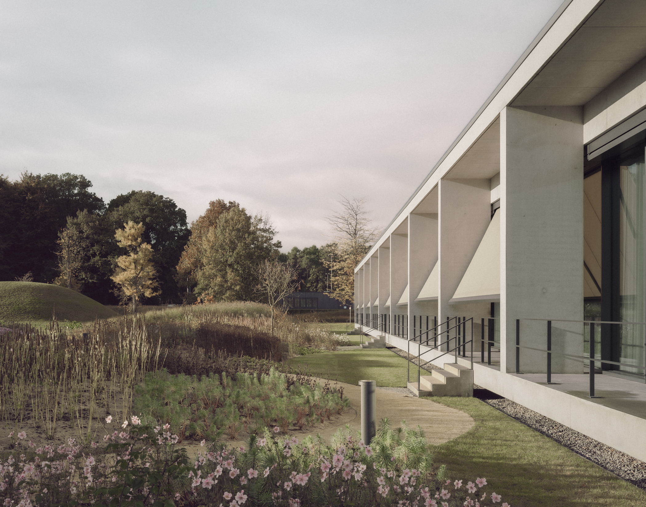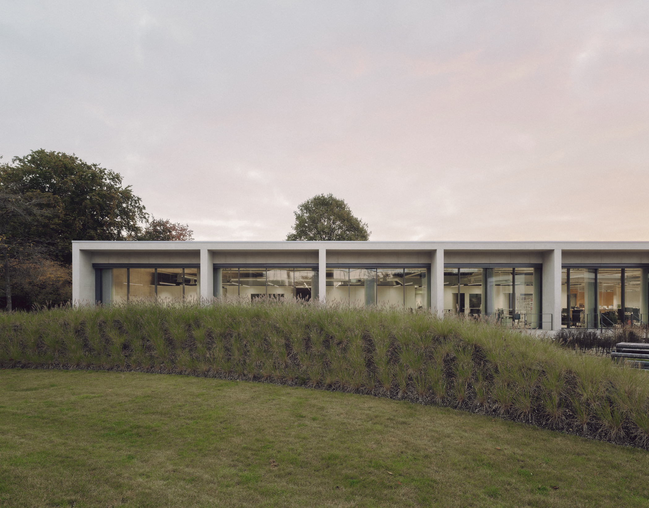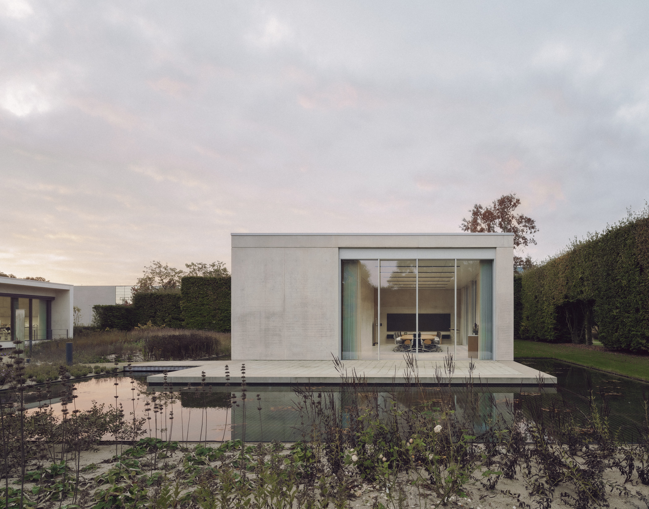 At the heart of the campus, the new pavilion forms a link between the Service Centre and the Creative Centre. Embedded within the landscape, the building provides a contemplative setting for meetings and workshops. Its monolithic concrete walls reference the materiality of the neighbouring buildings, while establishing a distinct and self-contained presence within the park.