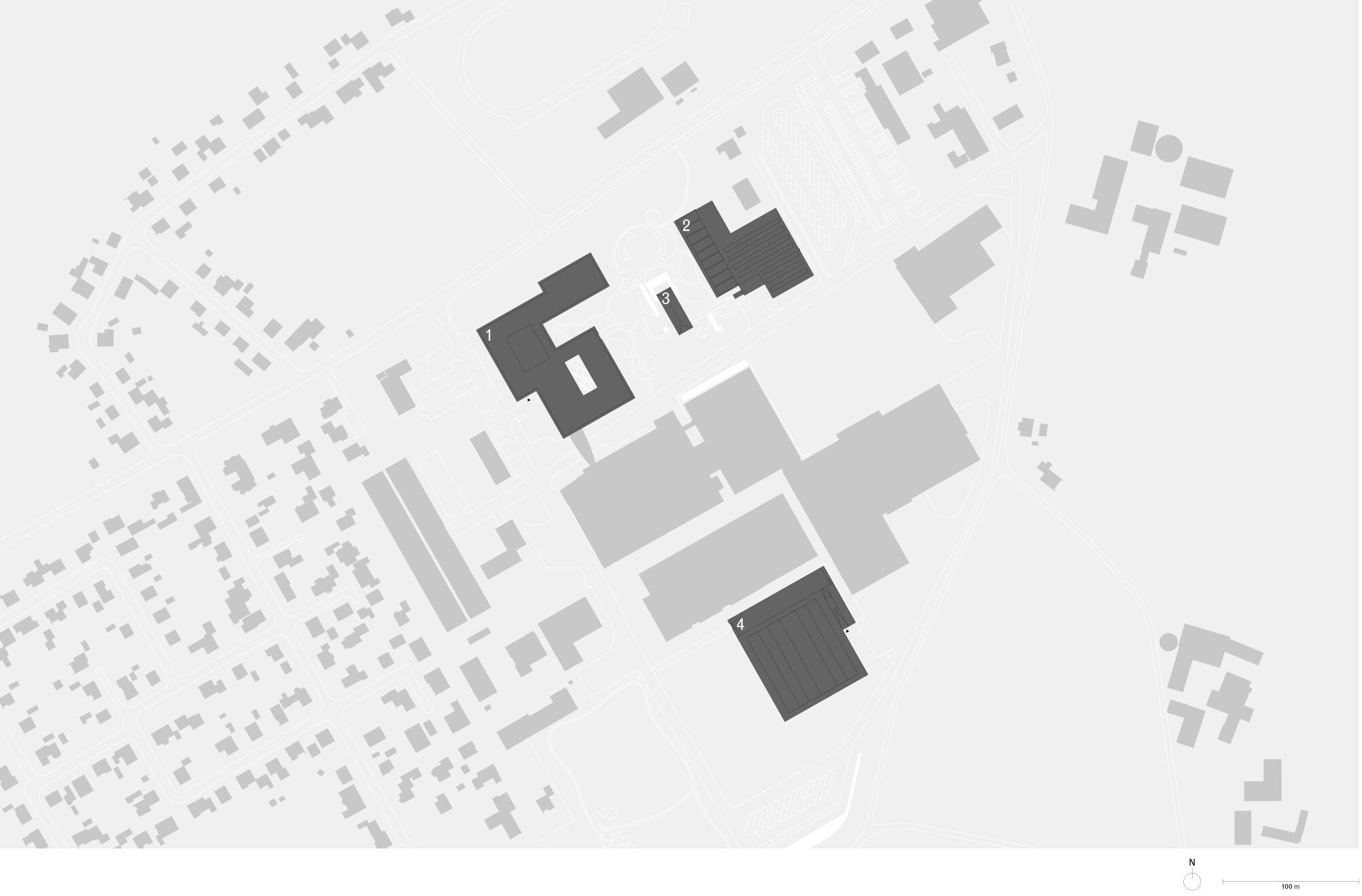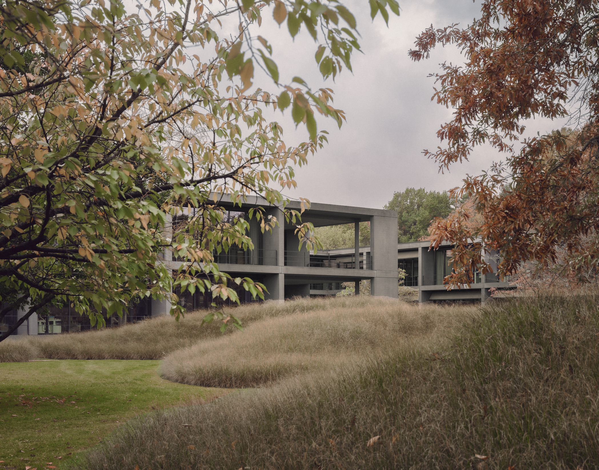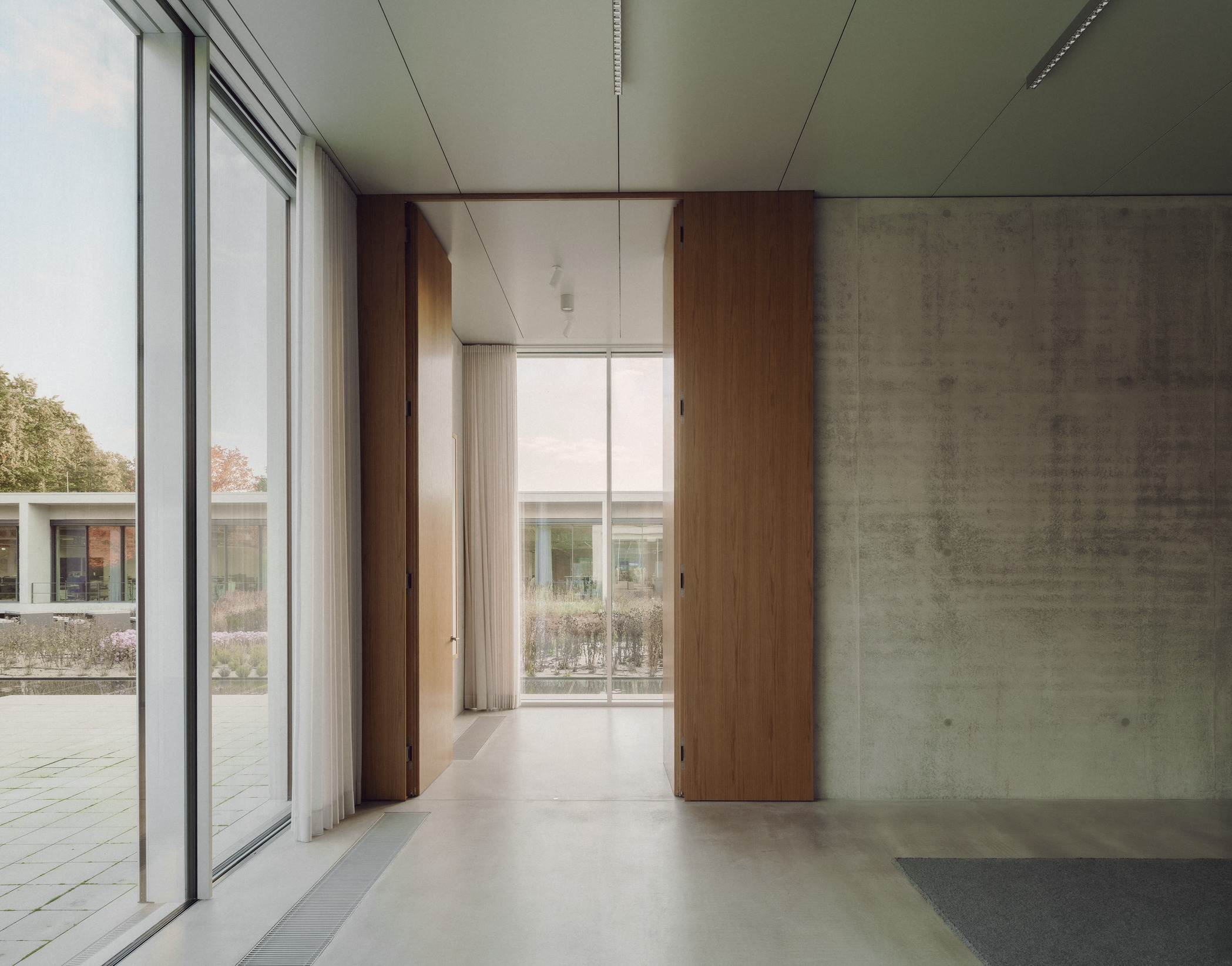 At the heart of the campus, the new pavilion forms a link between the Service Centre and the Creative Centre. Embedded within the landscape, the building provides a contemplative setting for meetings and workshops. Its monolithic concrete walls reference the materiality of the neighbouring buildings, while establishing a distinct and self-contained presence within the park.