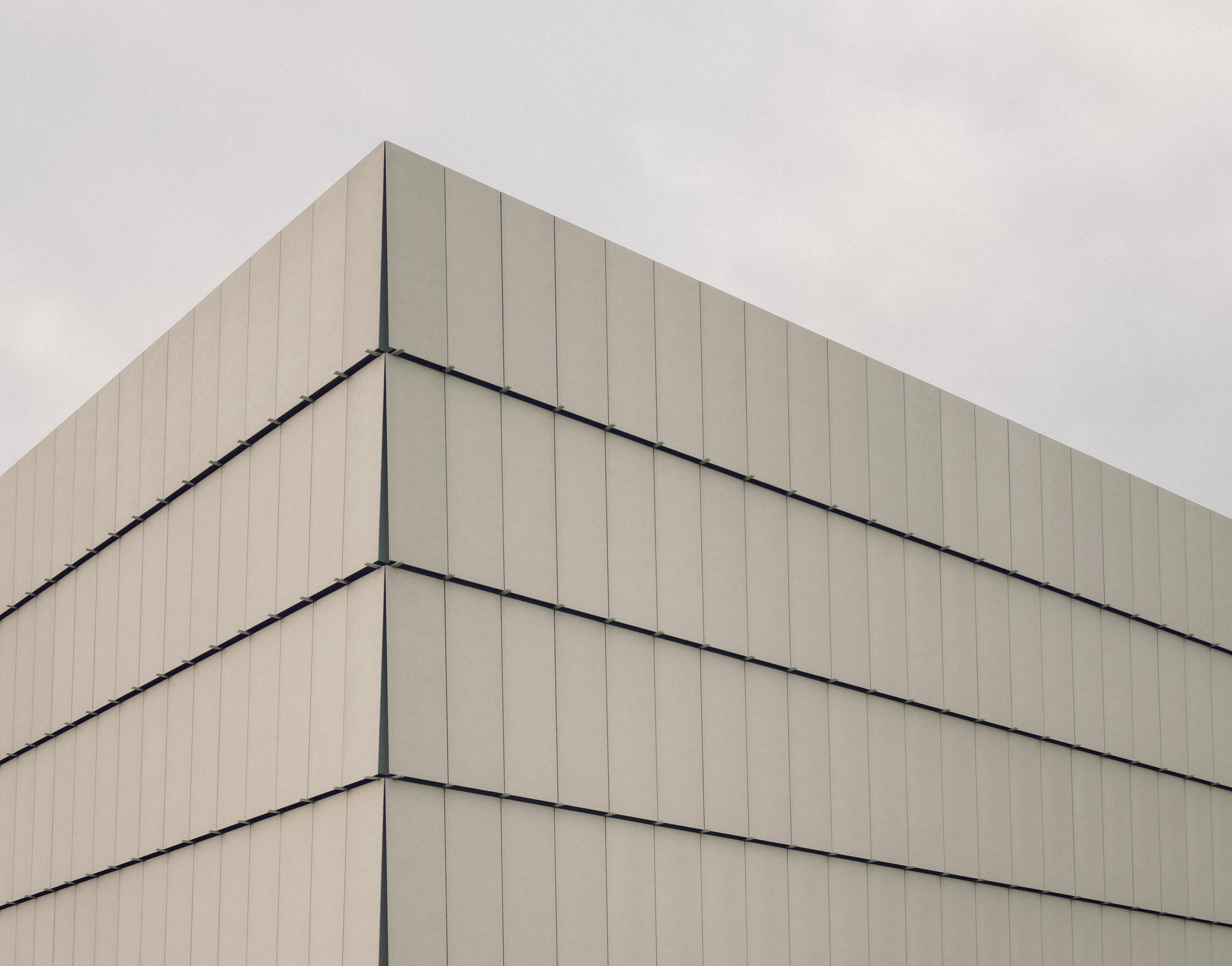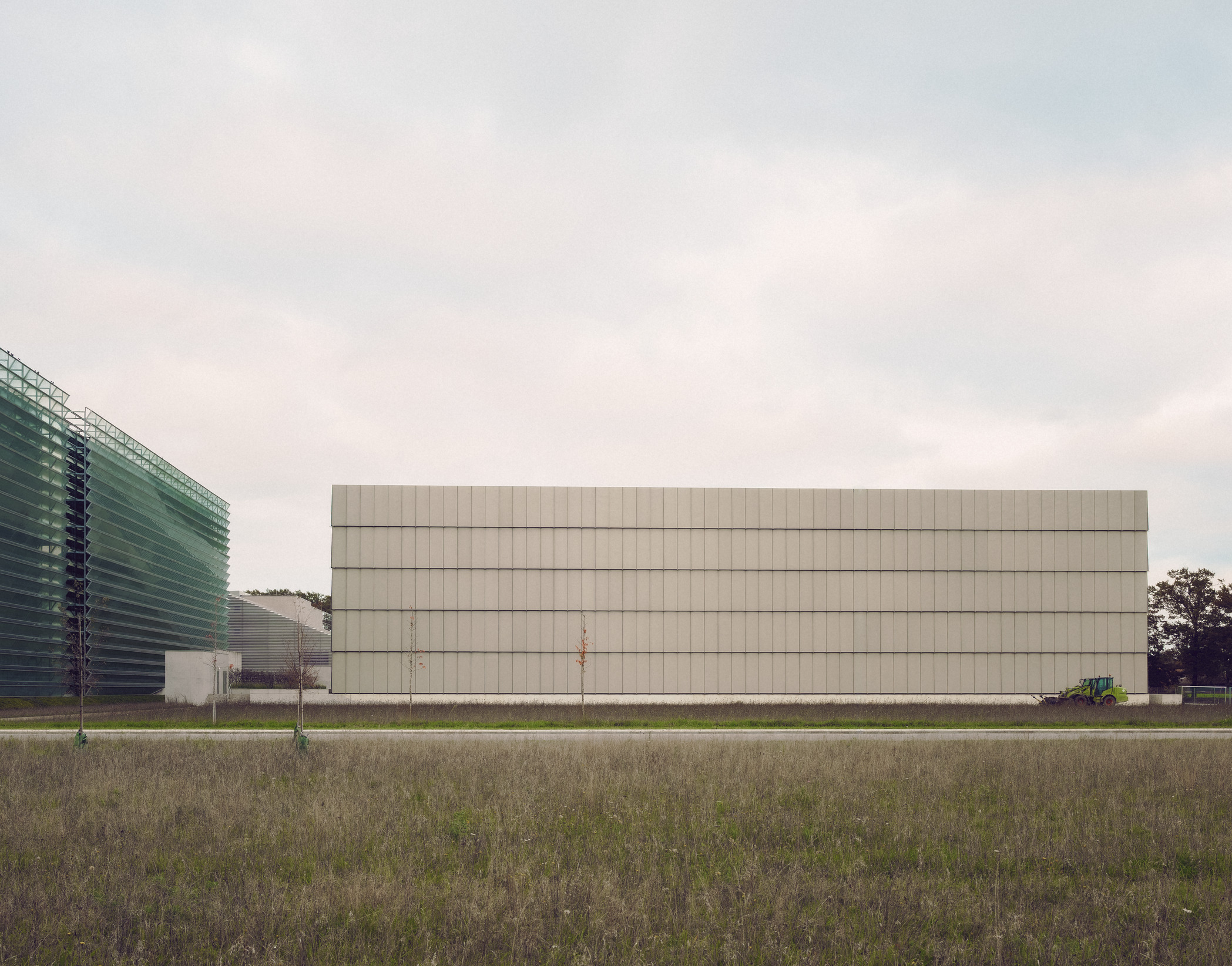 To the south, the AKL building responds to the logistical demands of a growing e-commerce operation. With a footprint of 80 by 85 metres, the building is defined by a clear and rigorous form. The high-bay racking system serves as the primary structure. It supports the façade as well as the green roof with its integrated photovoltaic panels, combining structure and function into a one cohesive form. Clad in large-format, angled glass fibre reinforced cement panels, visually resting on projecting battens, the façade evokes traditional timber stacking systems.