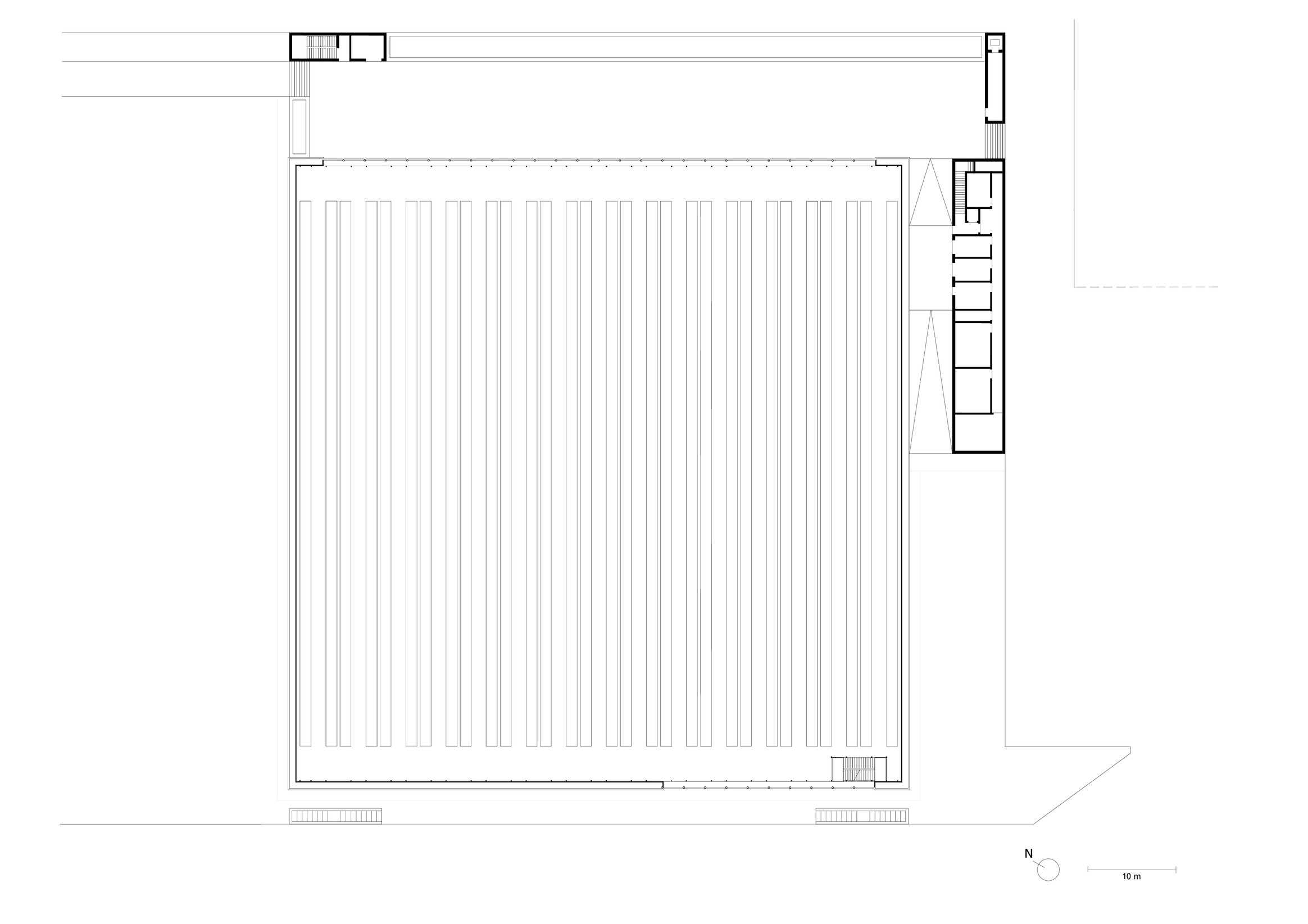 The Creative Centre transforms a former dispatch warehouse, extending and adapting the existing structure to create additional, generous office space. The intervention draws on the architectural language of the adjacent Service Centre, with deep loggias, retractable sunshades, and continuous floor-to-ceiling ribbon windows defining the façade. A load bearing, in-situ concrete façade enables for column-free interiors within the extension, allowing for flexible workspaces. The original hall, with its steel structure and saw-tooth roof, is retained and reinterpreted, preserving its industrial character while adapting to the requirements of a contemporary work environment.