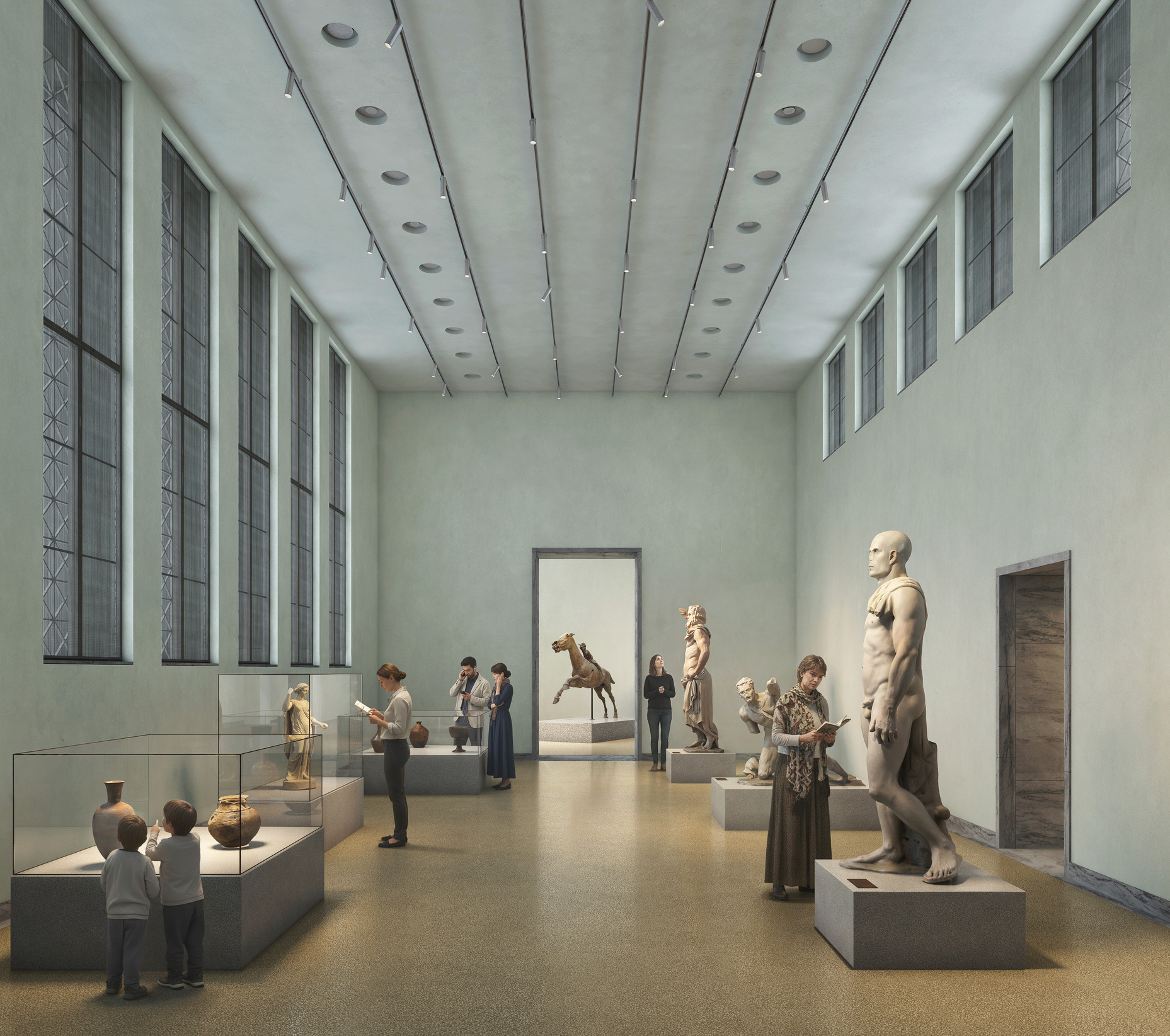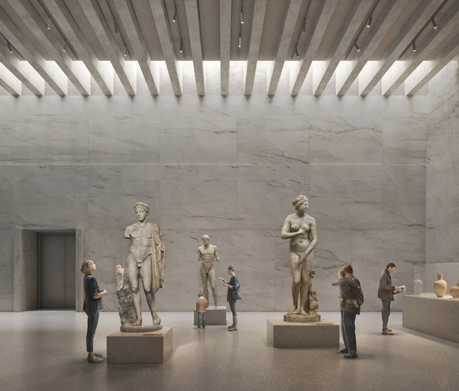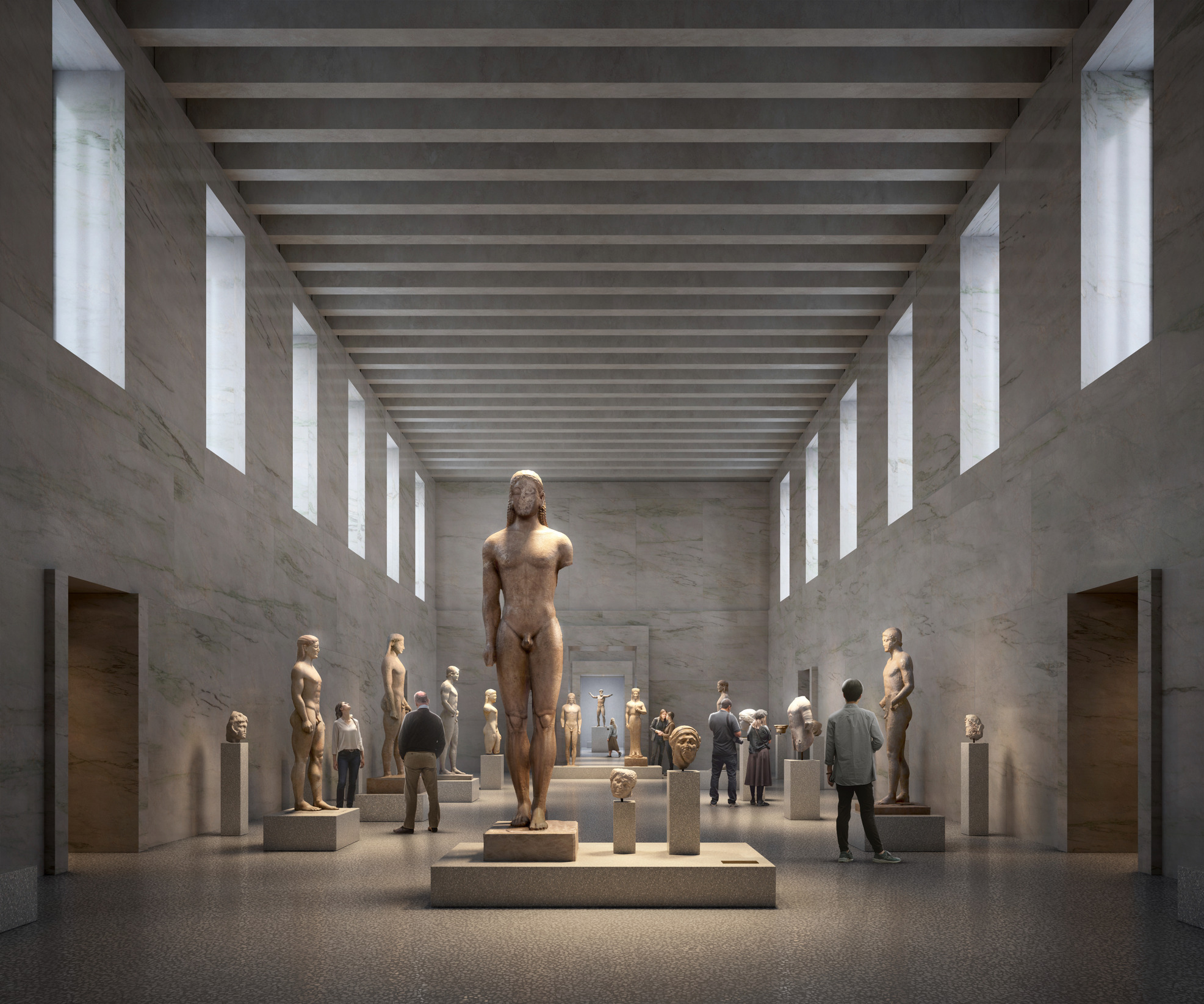 The monument requires significant functional and technical upgrades across both the public and back-of-house areas, including improved earthquake resilience, enhanced security standards, a stable indoor climate and better conditions for handling and storing artworks. On the ground floor, a central axis creates a coherent sequence of rooms that presents the development of Greek sculpture, culminating in the new Classical Hall. The annex, built in 1930 by George Nomikos, is transformed into a research centre housing a research library, state-of-the-art laboratories and study collections.