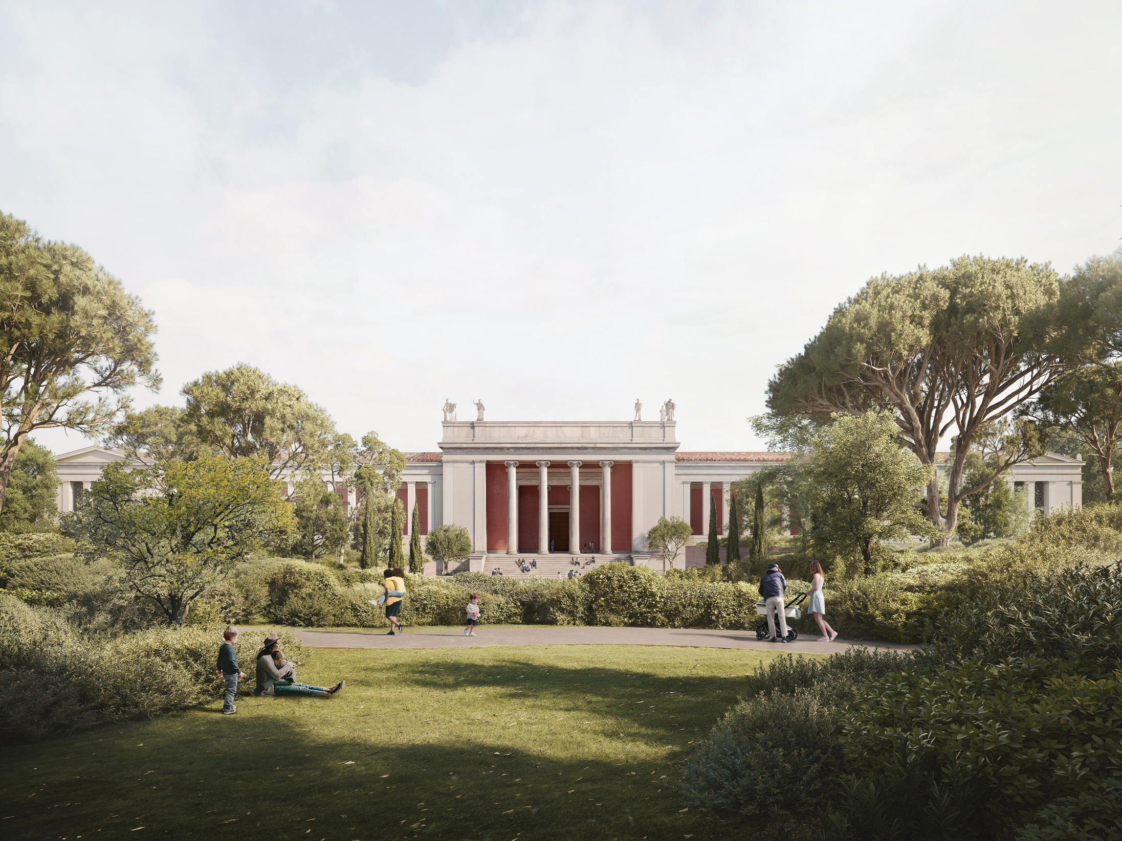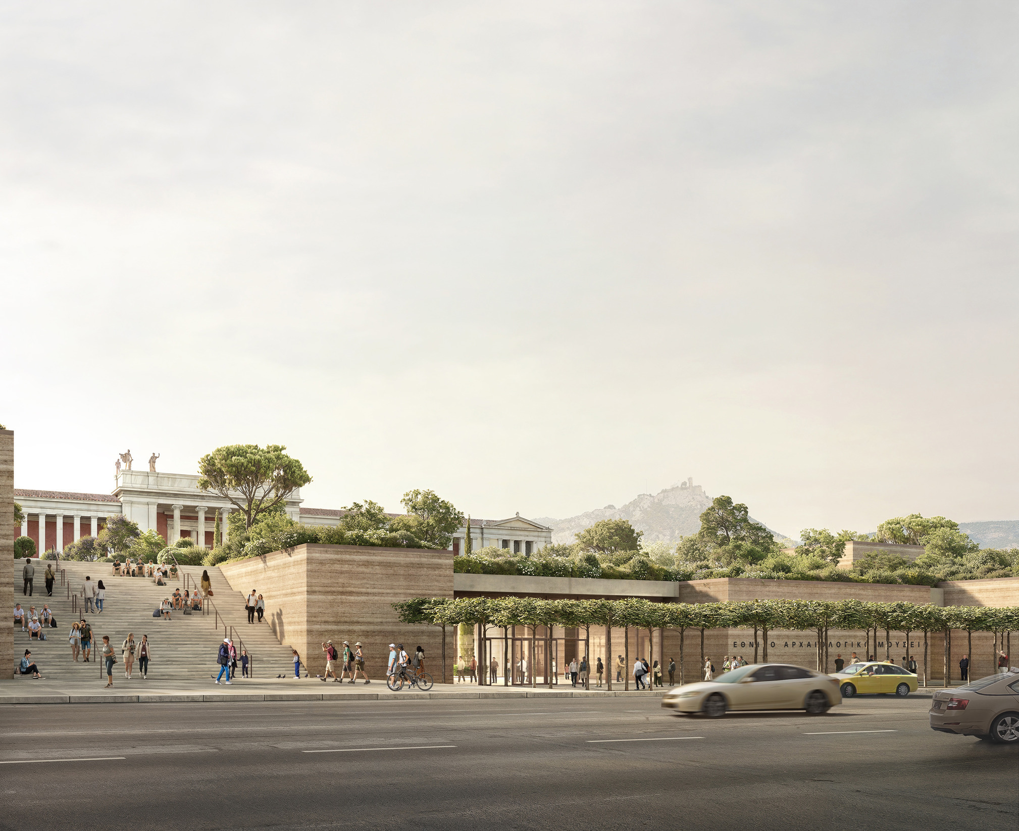 Drawing on the spirit of the original design – a romantic philhellenic idea of an urban landscape – the proposal creates a new setting for the monumental building. Respecting the classical hierarchy and responding to the existing topography, the plinth of the existing building is extended all the way to the street, allowing the original structure to maintain its symbolic power. In one gesture, this generates roughly 20,000 square metres of additional space including two floors of galleries beneath a raised landscape, framing the historical building with nature.
