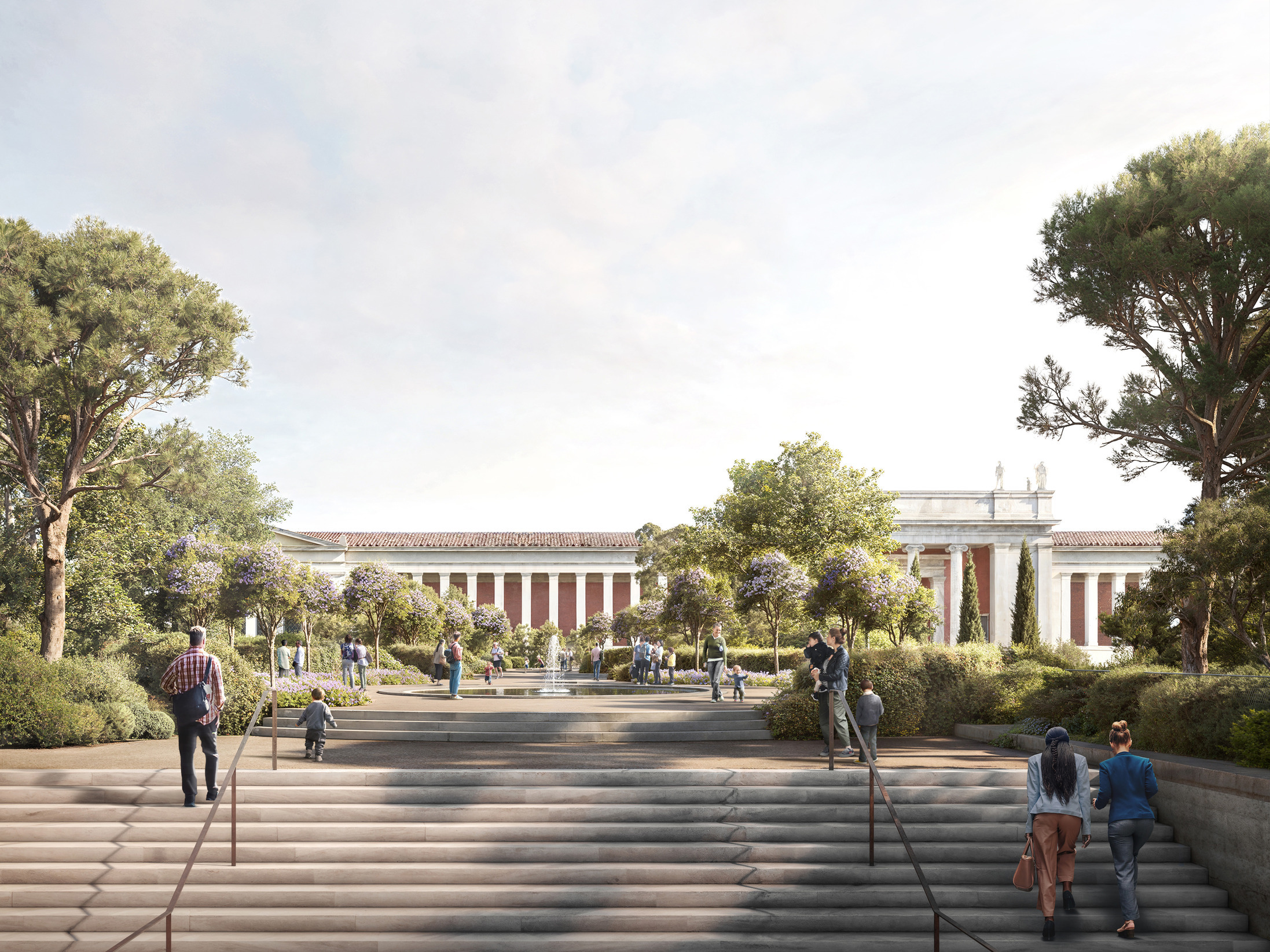 The museum garden provides a quiet, green public space elevated above the bustling city and recalls the ancient Greek ideal of a civic gathering place. The landscape, designed by Wirtz International, contains gravel paths, lawns, groups of Umbrella and Aleppo pines, evergreen Holm oaks and shrubs, referencing nineteenth-century parks. Accessible from all directions, it contains a sunken, sheltered courtyard at the centre. The existing monumental staircase is extended into this space, binding together old and new, and providing a meeting point for museum visitors and Athenians.