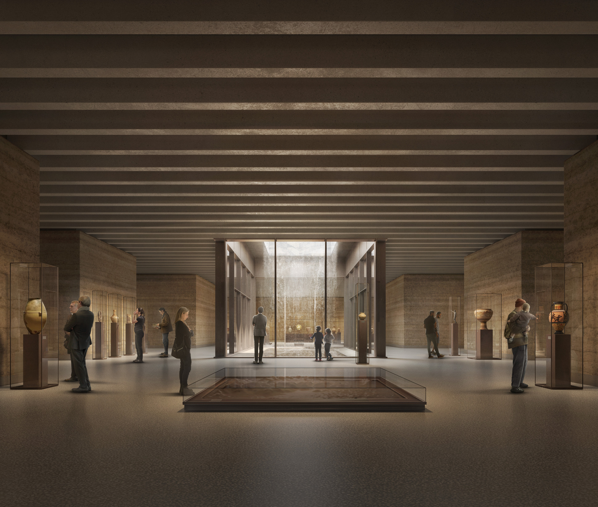 The plan is made up of a series of dispersed monolithic volumes that define a fluid sequence of spaces that draw visitors towards the historic building and offer oblique views into the galleries along the way. The rammed-earth walls reinforce the excavated nature of the extension and together with the play of light and shadow form distinctive settings for exhibiting artefacts and sculptures that enrich the historic exhibition spaces.