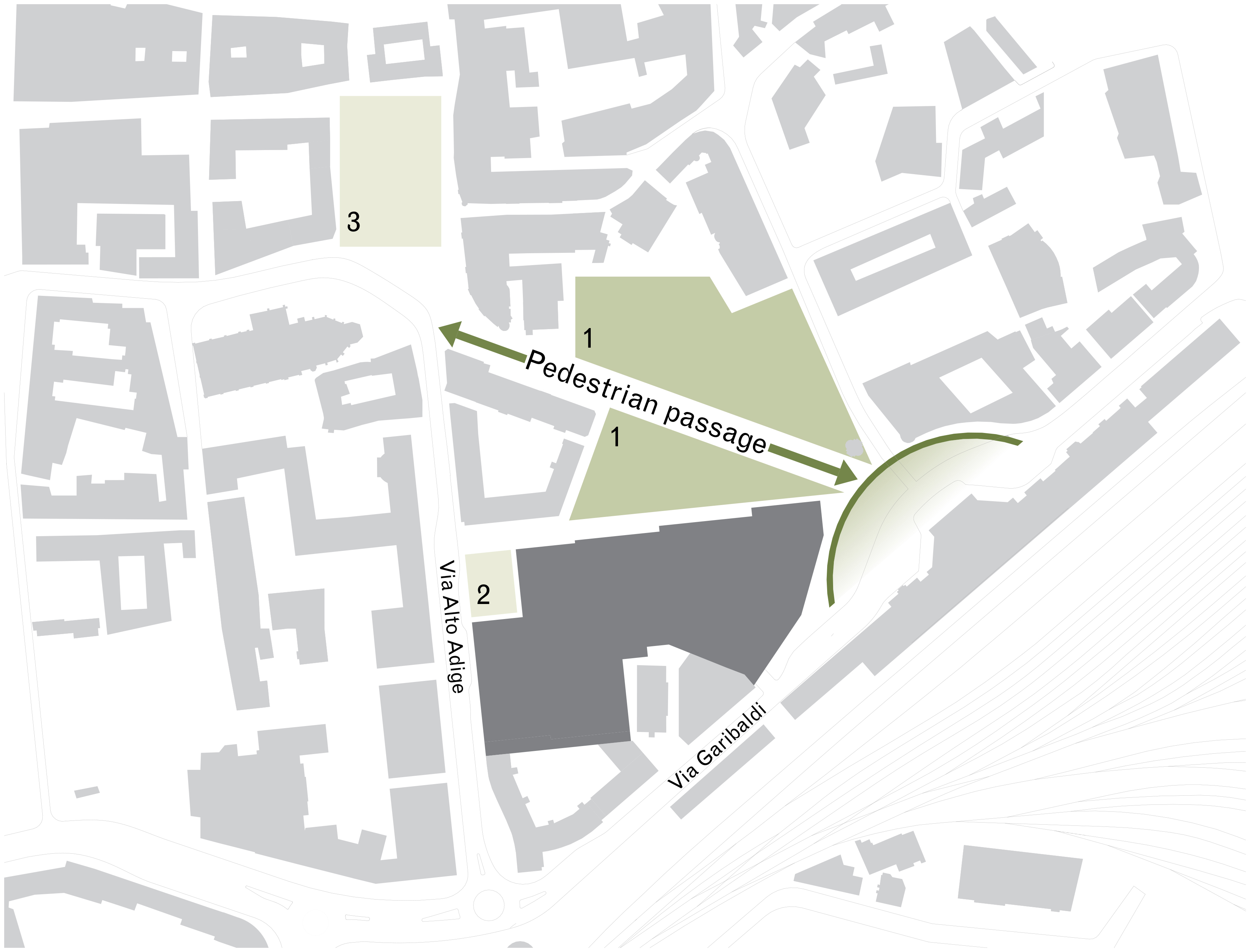 Bounded by Via Garibaldi, Via Alto Adige and Viale della Stazione, the area suffered extensive damage during the Second World War and was substantially rebuilt in the 1950s and 1970s. In more recent years, the existing urban fabric had fallen into disrepair. Based on a wider masterplan for redevelopment of the area surrounding the train station, the project replaces this fragmented and heterogenous environment with a coherent urban figure that responds to the scale and characteristics of the immediate context.